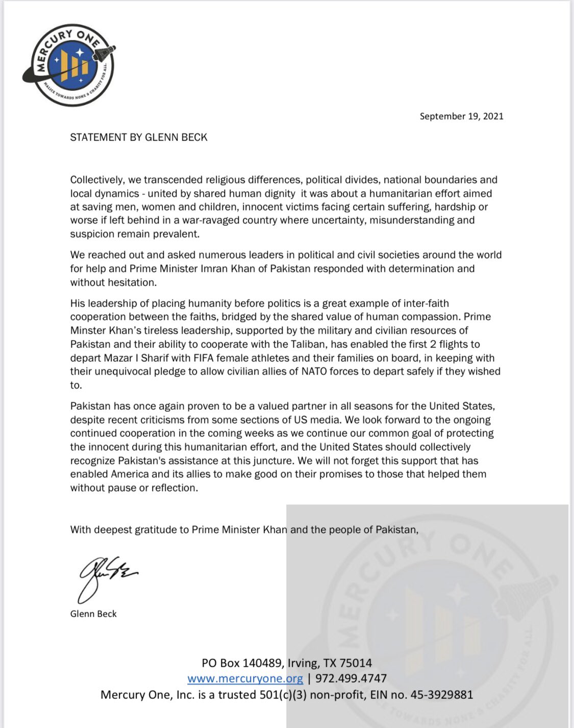 In a statement released by Glenn Beck this Sunday, he thanked the Prime Minister for taking the lead on saving innocent lives and showing compassion for the abandoned people of Afghanistan. He detailed that his team had reached out to numerous political leaders around the world to discuss the situation in the war-ravaged country but PM Imran was one of the very few who responded with determination. He said the premier's values of placing humanity before politics is a great example of inter-faith cooperation.