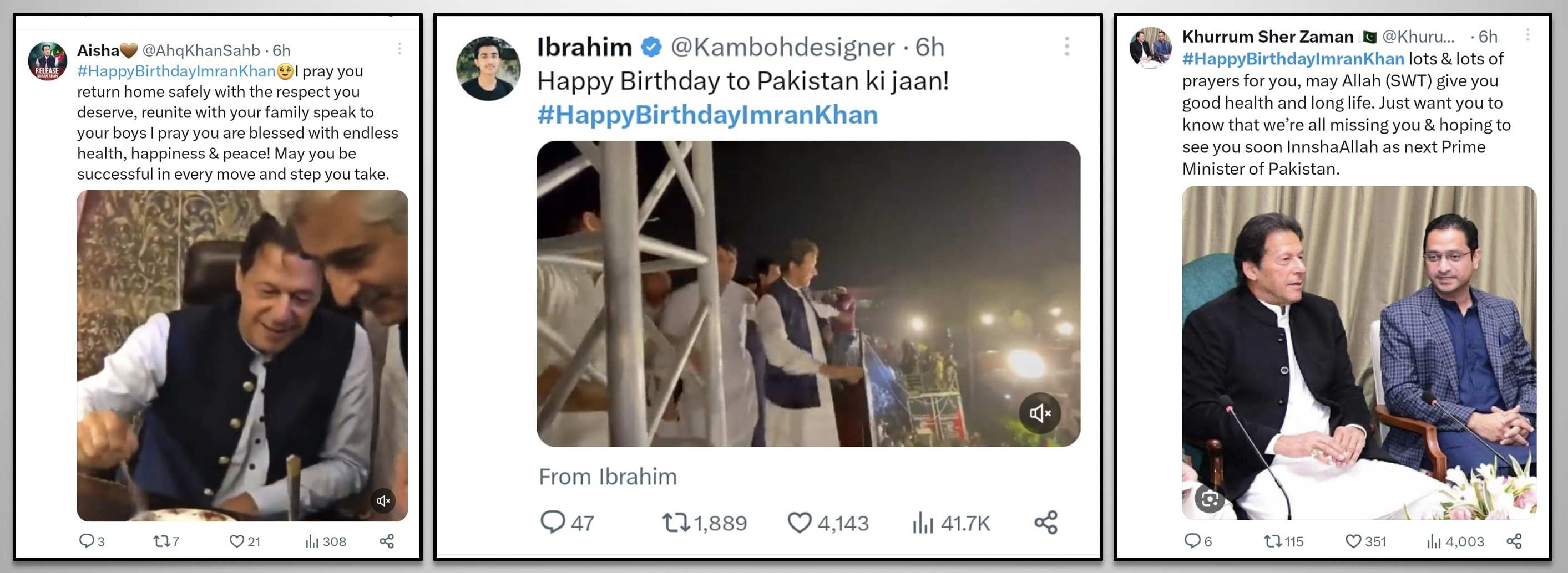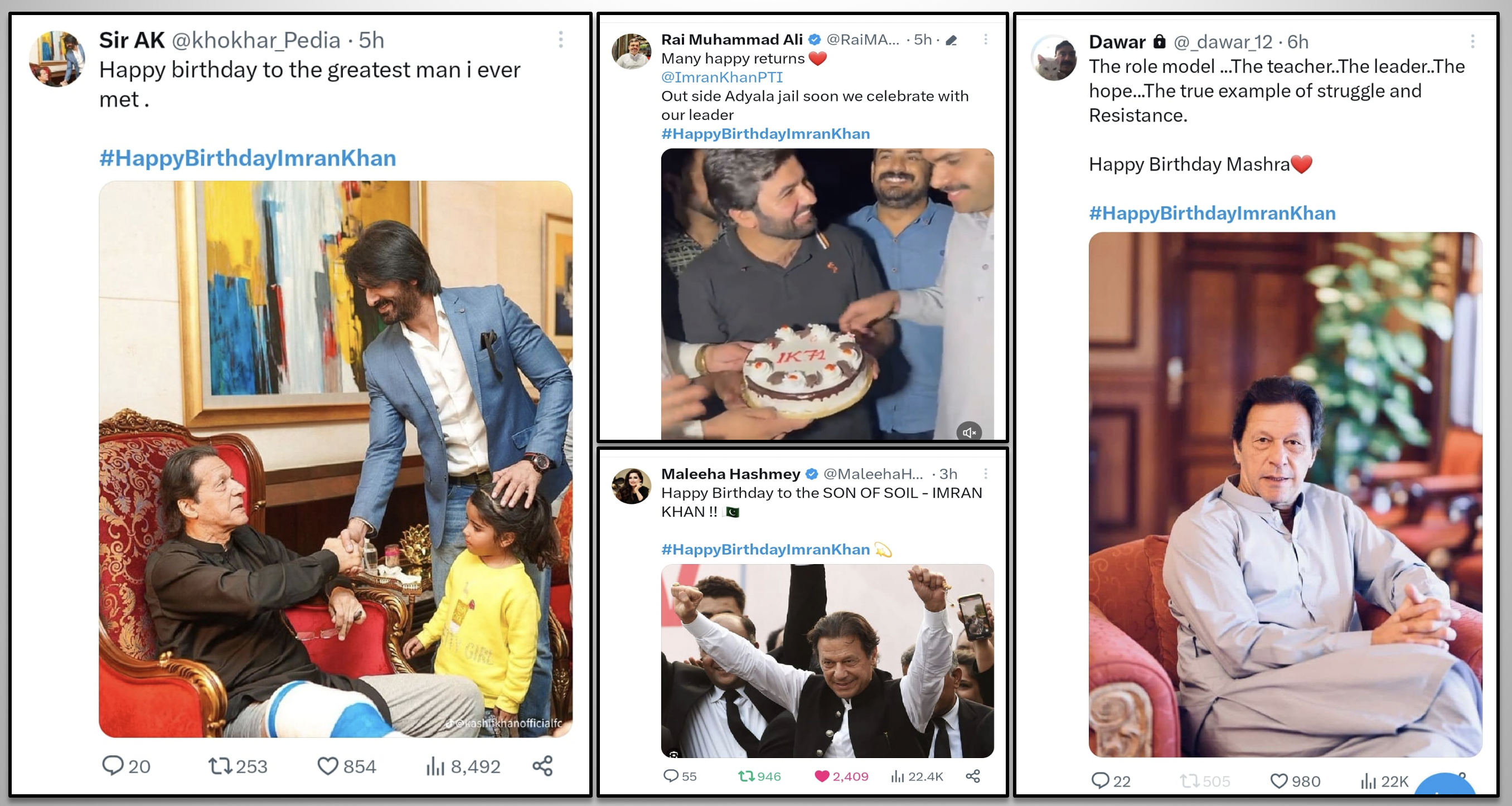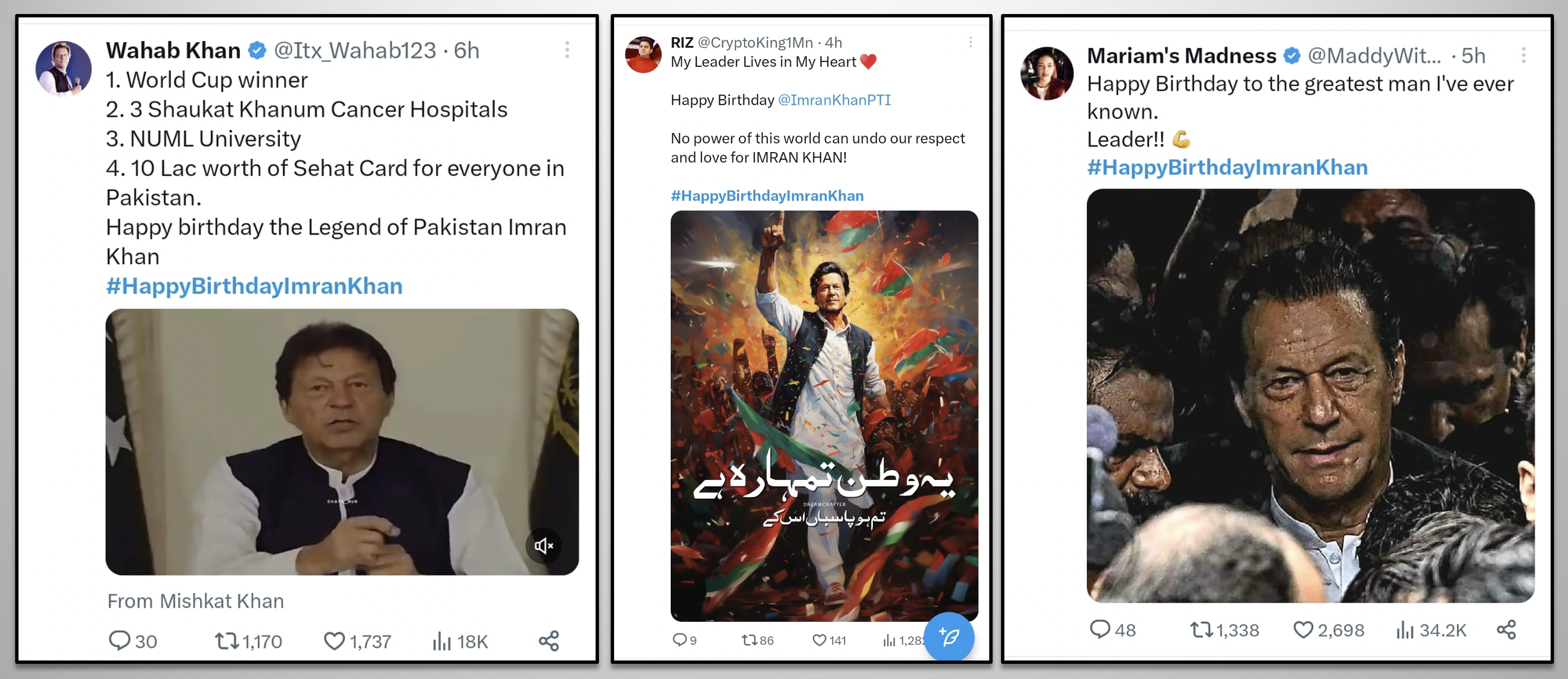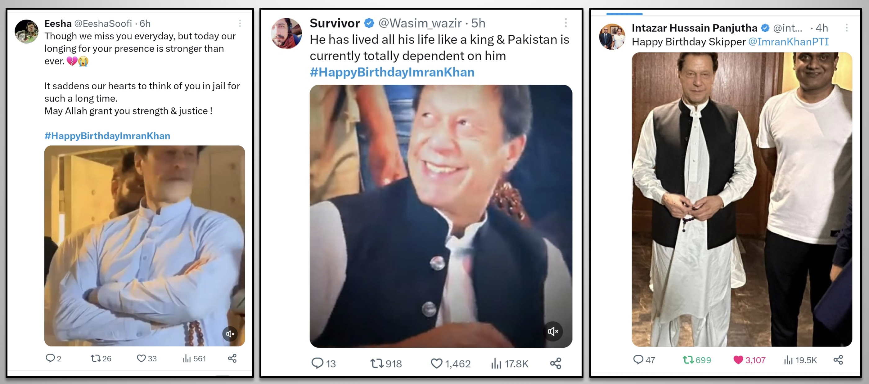 While the most popular leader of Pakistan, loved and respected by millions, is illegally imprisoned in inhumane conditions as a result of political victimization, the nation pays tribute to this great leader through social media. The hashtag #HappyBirthdayImranKhan becomes a top trend in many countries around the world and reaches the 2nd spot in worldwide trends. Former PM Imran Khan received heartfelt messages full of love, respect, and prayers for his health, long life, and immediate release. Let's take a look at some of the tweets by people from different walks of life.