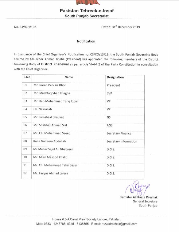 Members of the governing body PTI Khanewal have been notified | Pakistan Tehreek-e-Insaf